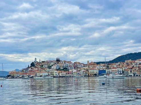 Blick auf die Insel Poros von Galatas aus, die mit einem Taxi-Boot erreicht werden kann. Mit dem Wohnmobil könnte man nur auf die andere Seite in den Hafen fahren, aber nicht dort übernachten.